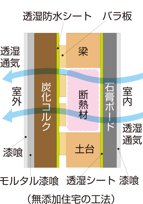 無添加住宅の壁は全て透湿性のある材料でできています。